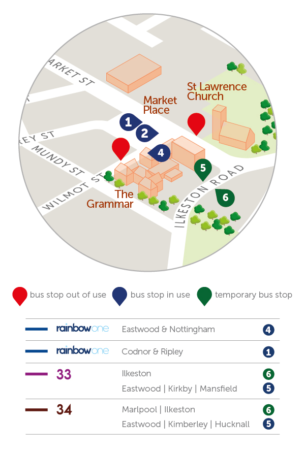 From Monday 23 February until Friday 17 April, the Heanor Church stop on Church Street will be closed while Derbyshire County Council carry out major improvement works.